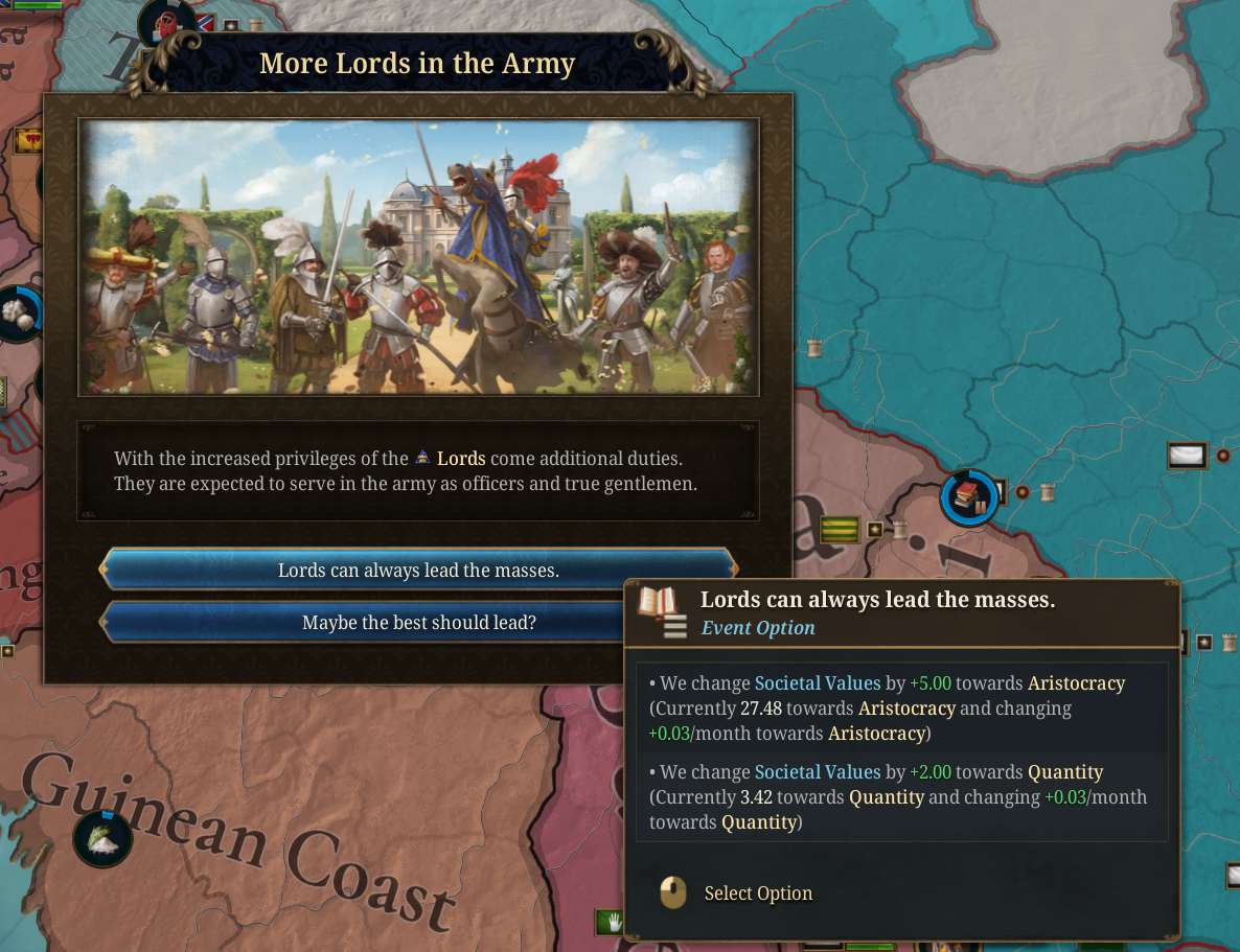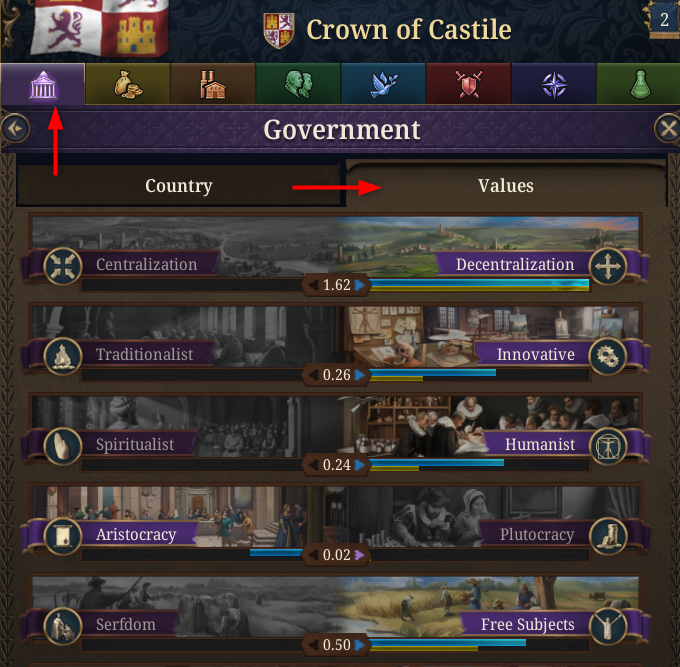 Values also unlock certain government Reforms (the Crown version of Estate privileges) and events once they’re at certain levels.