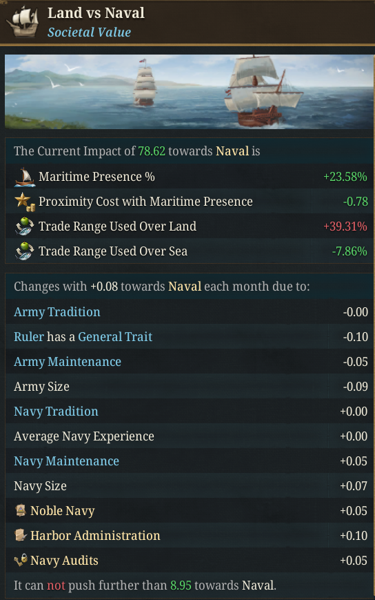 Here I have 0.08 towards Naval each month and the tooltip is telling me I’m limited to 8.95 – but via events and parliaments I’ve stacked 78.62.