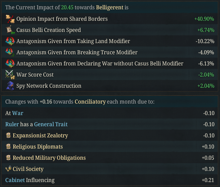 Note that there are modifiers in both directions, with my Cabinet member, the law Civil Society and the privileges Reduced Military Obligations and Religious Diplomats pushing towards Conciliatory, and the privilege Expansionist Zealotry as well as the facts that I’m at war and my ruler has a general trait pushing me back towards Belligerent.