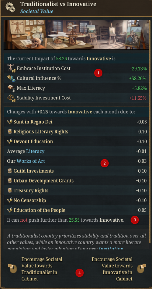 The second section (2) shows you the monthly progress (0.25), as well as which privileges, laws, and modifiers add up to that number. Below that (3) is telling you the limit to which it can push by itself (25.55 for Innovative).
