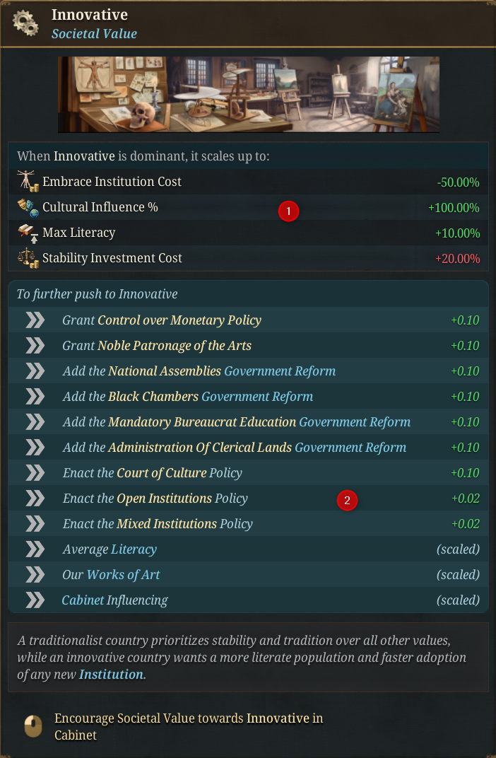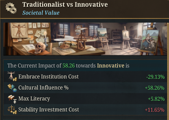 My nation is quite Innovative, meaning that it is 29% cheaper to embrace institutions and I get 58% more Cultural Influence and 6% more max Literacy. It also, however, makes it 12% more expensive for me to push my stability up, costing more Gold.