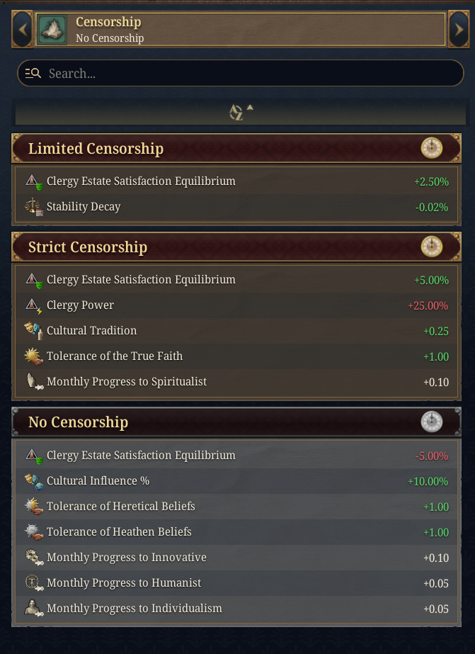 Laws – No Censorship gives me Innovative and Humanist, both of which I’m aiming for in this run, but also Individualism, which I don’t want. It also gives me -5% Clergy Satisfaction Equilibrium, which impacts research speed.