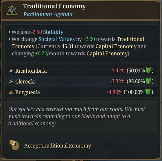 Parliament Agendas – these are essential to getting your issues passed, and sometimes you will get Agendas to push values in the direction you want, but equally as often the agendas will be in the wrong direction. They also hurt Estate satisfaction and Stability.